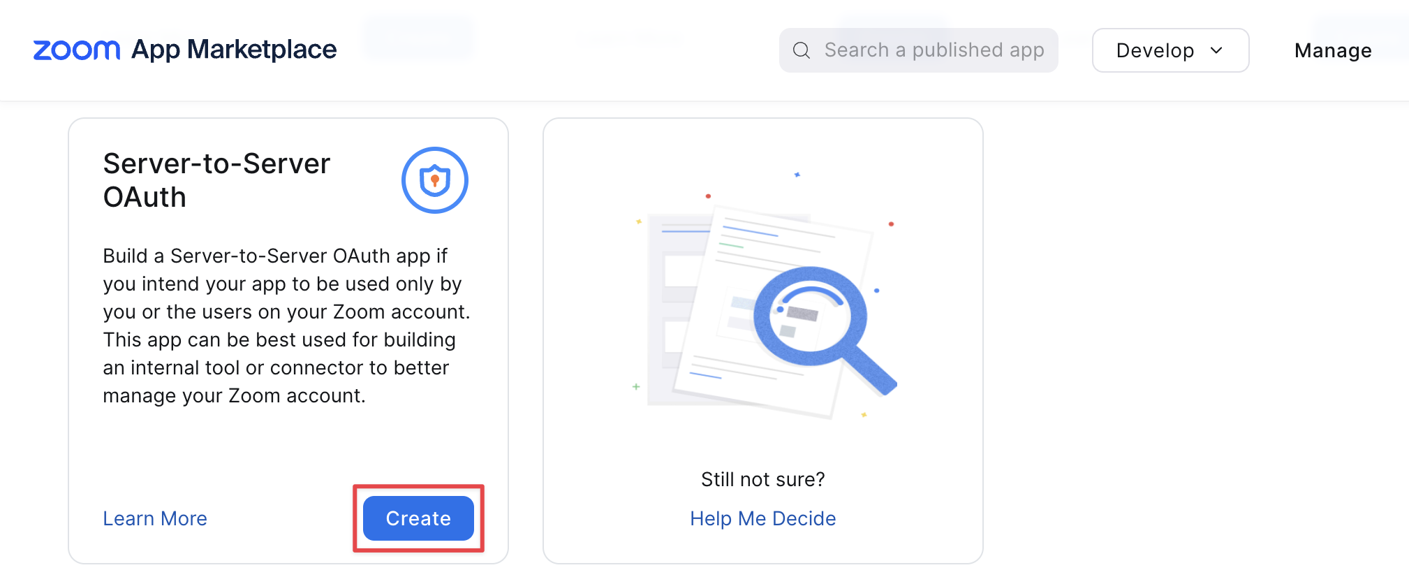 「Server-to-Server OAuth」の[Create]をクリックします。
