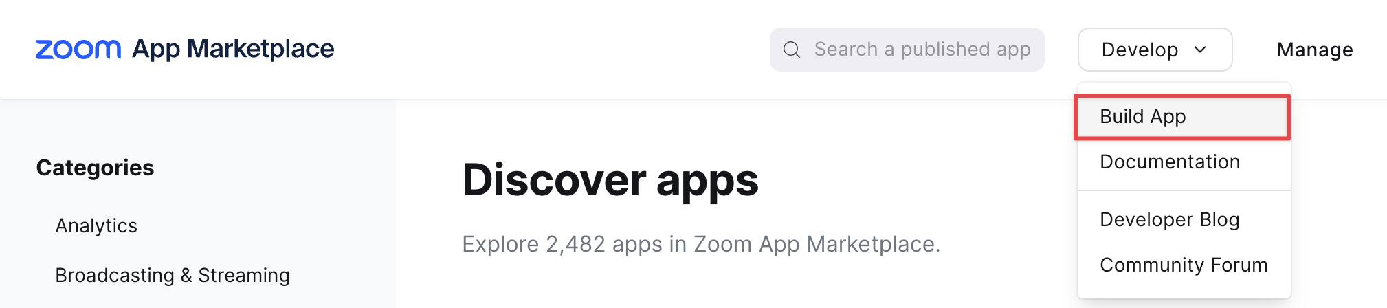 - 画面右上の[Develop]をクリックし、表示されるメニューから「Build App」を選択します。