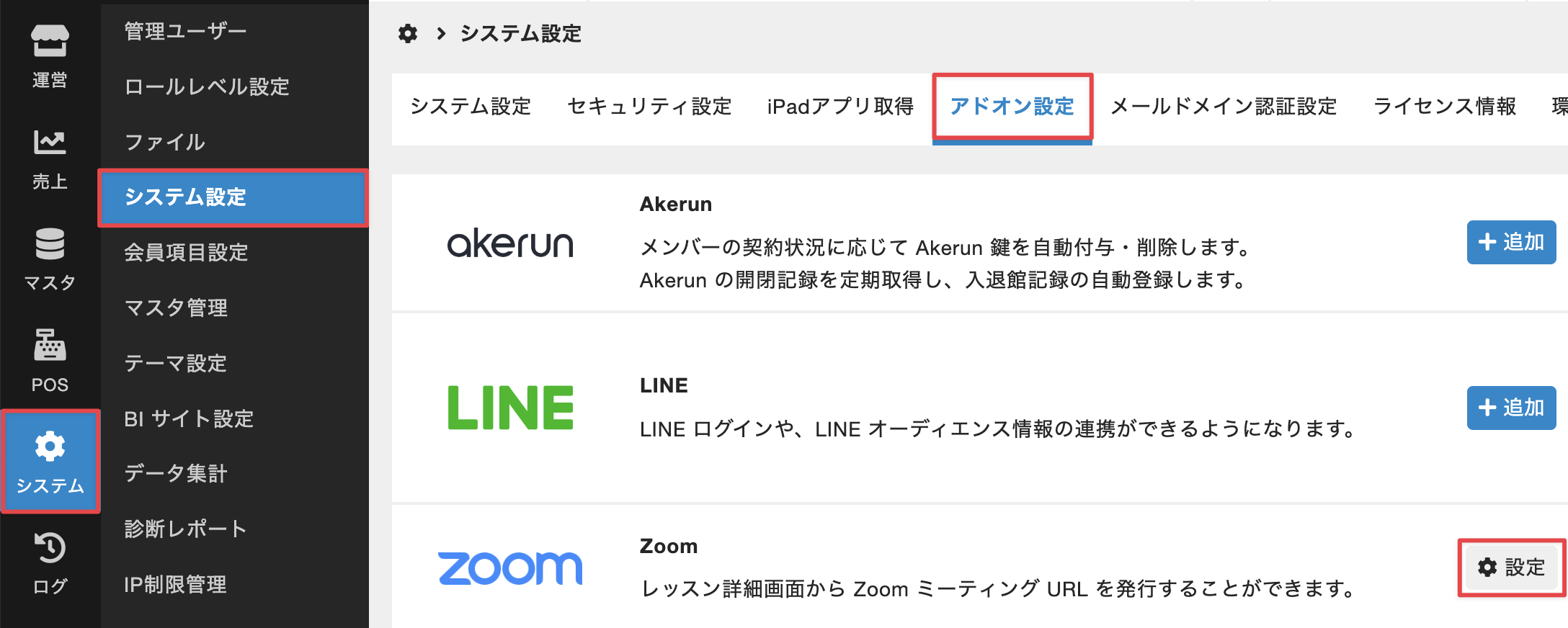 - 管理サイトのサイドバーから[システム]>[システム設定]を選択し、システム設定の画面で[アドオン設定]タブを選択して、「Zoom」の[設定]をクリックします。
