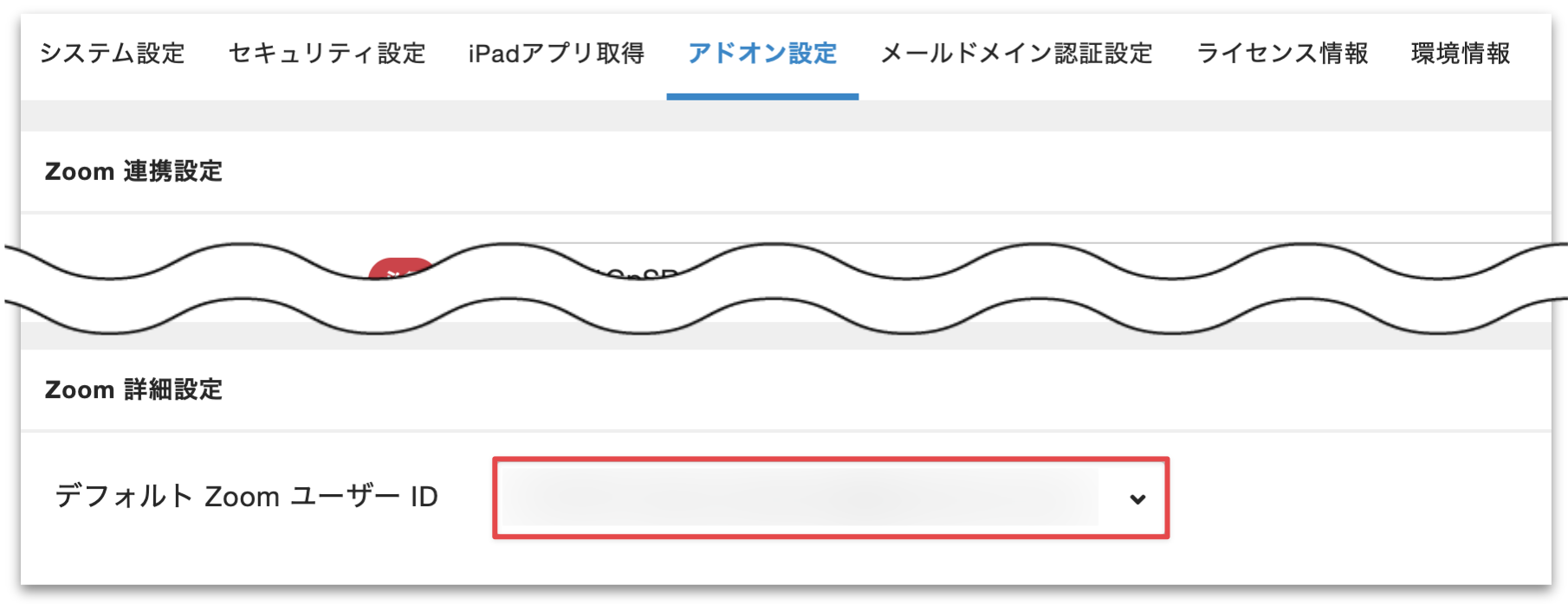 [Zoom 詳細設定]の[デフォルト Zoom ユーザー ID]に、Zoomのアカウント名が表示されていれば、設定完了です。