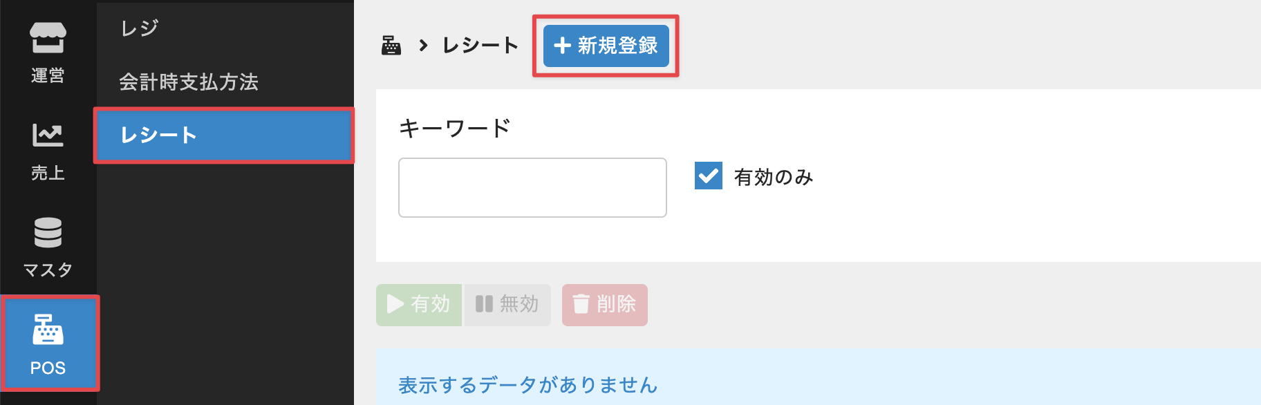 - 管理サイトのサイドバーから[POS]>[レシート]を選択し、レシートの一覧画面で[新規登録]をクリックします。