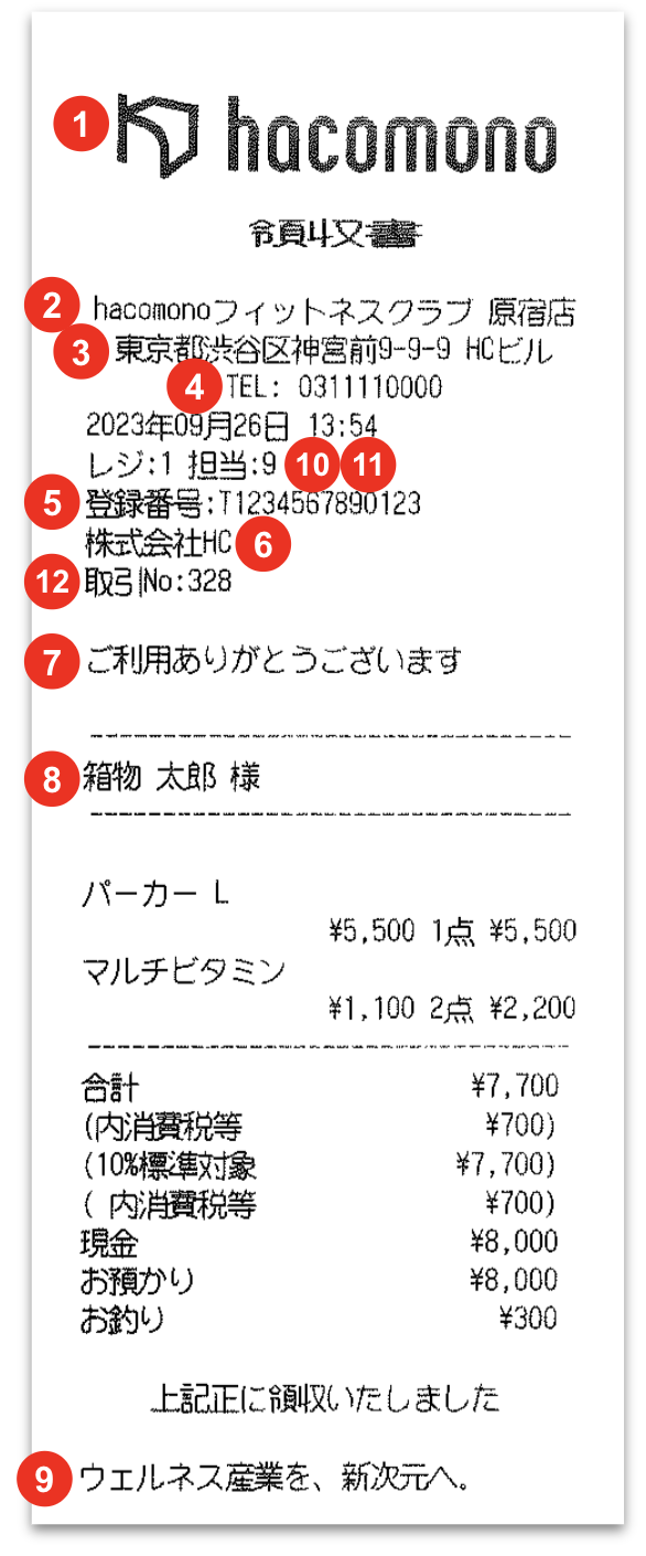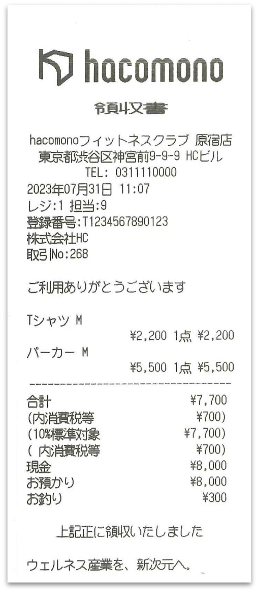 レシートには、会計情報のほかに、店舗名や住所、適格請求書登録番号などが印刷されます。
