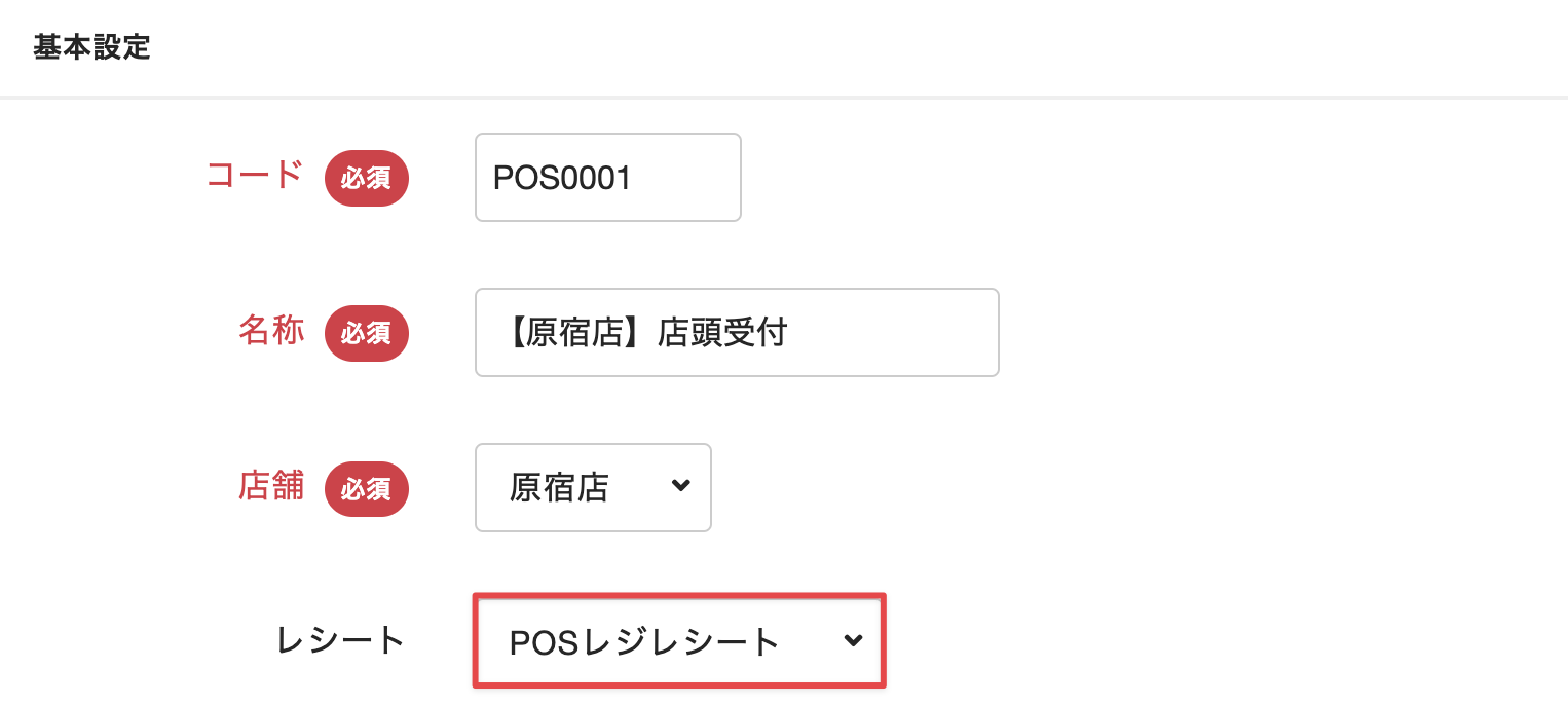 [レシート]から、このレジのレシート印刷に使用するレシートマスタを選択します。