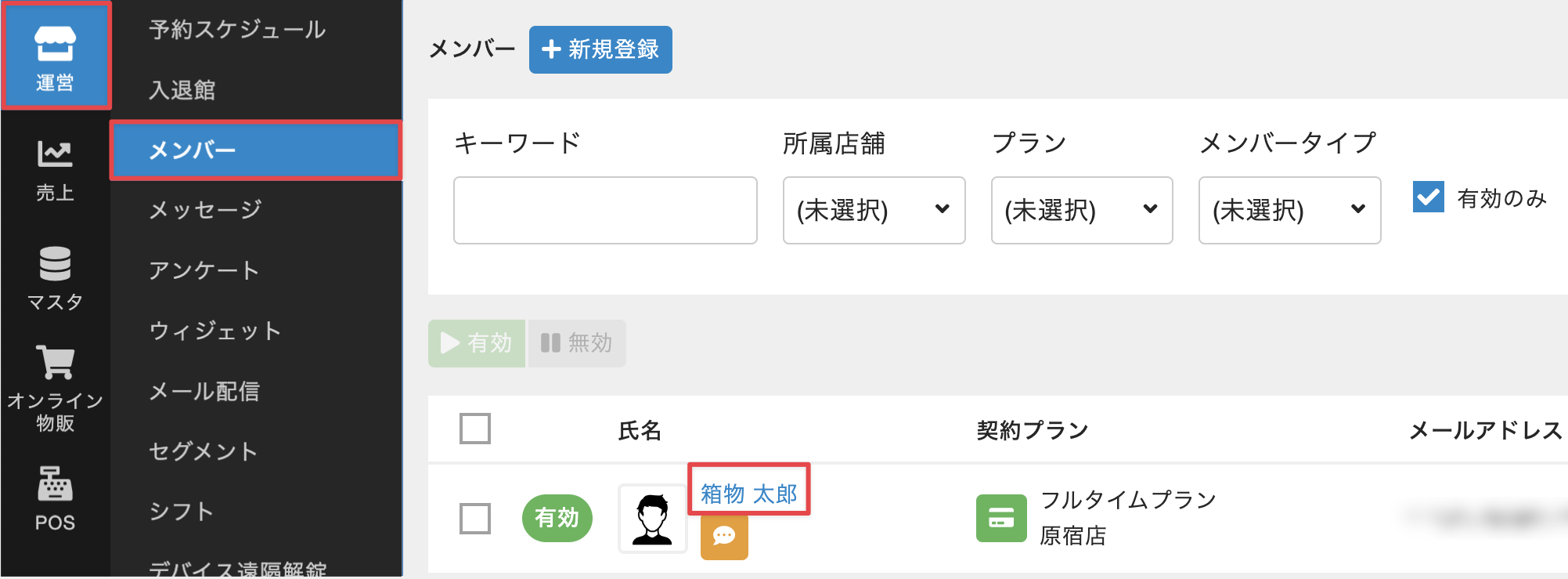 - 管理サイトのサイドバーから[運営]>[メンバー]を選択し、メンバーの一覧画面で対象メンバーの氏名をクリックします。