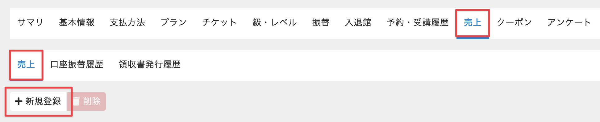メンバー詳細画面で[売上]>[売上]タブを選択し、[新規登録]をクリックします。