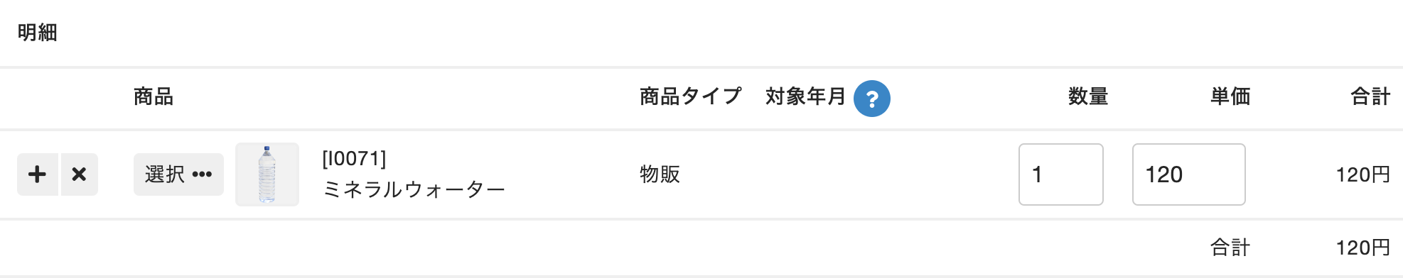 [明細]の[選択]をクリックして商品を選択し、必要に応じて[数量]を変更します。
