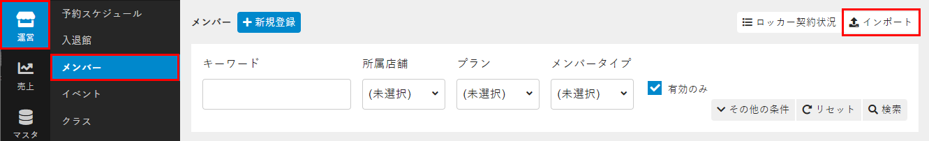 | 店舗コード | メンバーが契約するクラスに設定されている店舗の店舗マスタの[コード](必須)。 |