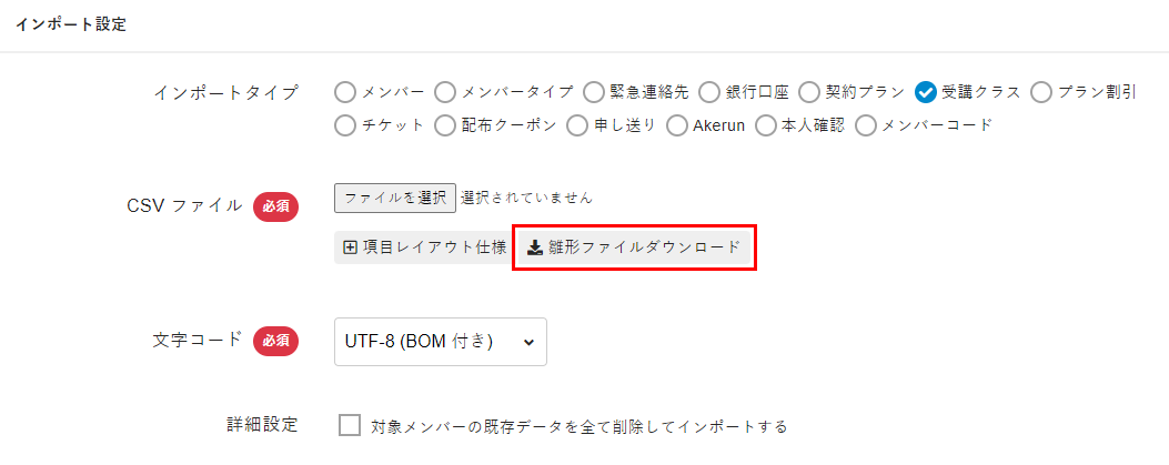 エラーの対処方法については、「CSVインポートでエラーが発生してしまった場合はどうすればよいですか?」を参考にしてください。 - CSVファイルに入力されているメンバーの契約がすでに登録されている場合は、[対象メンバーの既存データを全て削除してインポートする]にチェックを入れます。