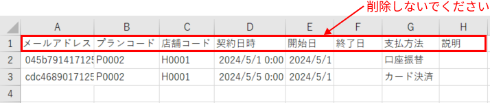 - 2行目から、インポート対象のメンバーのメールアドレス、プランコード、店舗コードなどを入力します。