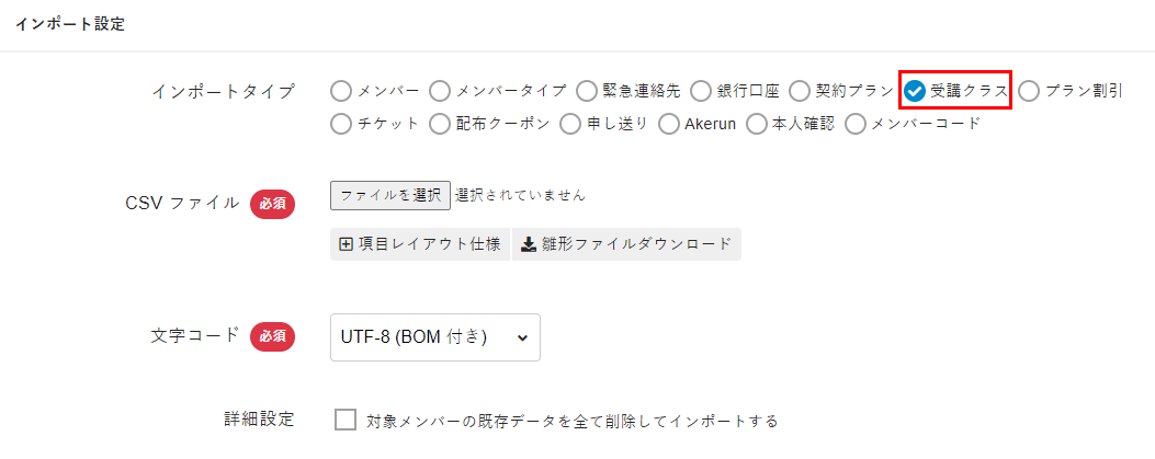 - [インポートタイプ]から[受講クラス]を選択します。
