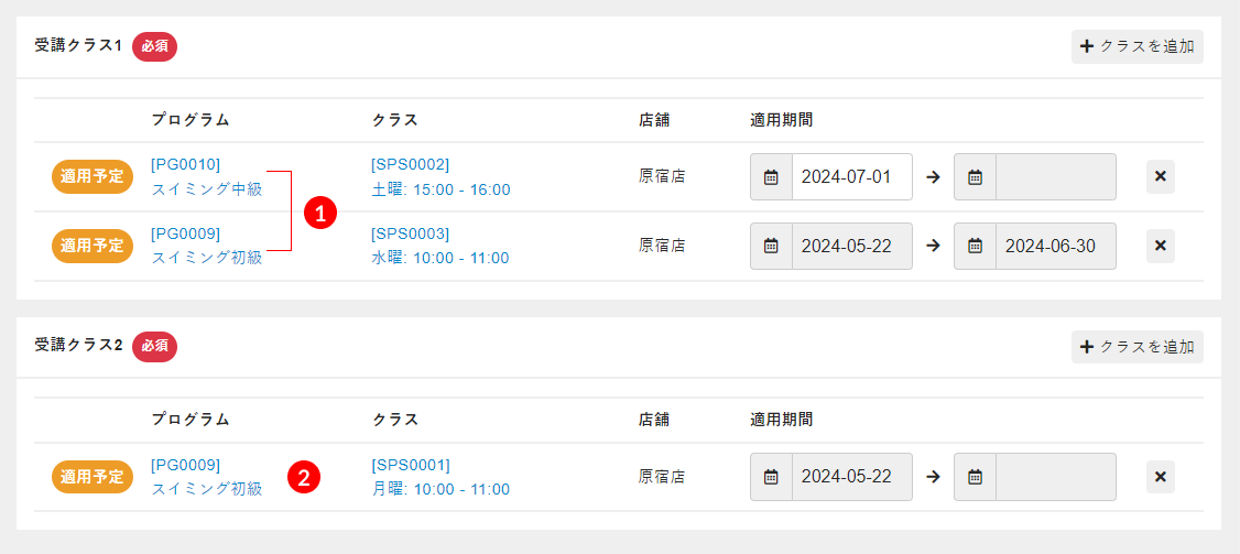 | 受講クラス1_番号 | メンバーが契約するプランのプランマスタの[週あたりの受講回数]に対応した整数(必須)。 登録するクラスをどの受講クラスに含めるのかを入力します。[受講クラス1]に設定するクラス(下記Noteの�@)であれば「1」、[受講クラス2]に設定するクラス(下記Noteの�A)であれば「2」を入力します。 複数のクラスを設定する場合は、「受講クラス1_番号」から「受講クラス1_終了日」までのすべての列を追加し、項目名は「受講クラスN_番号」の「N」の部分を連続した数字にします。 |