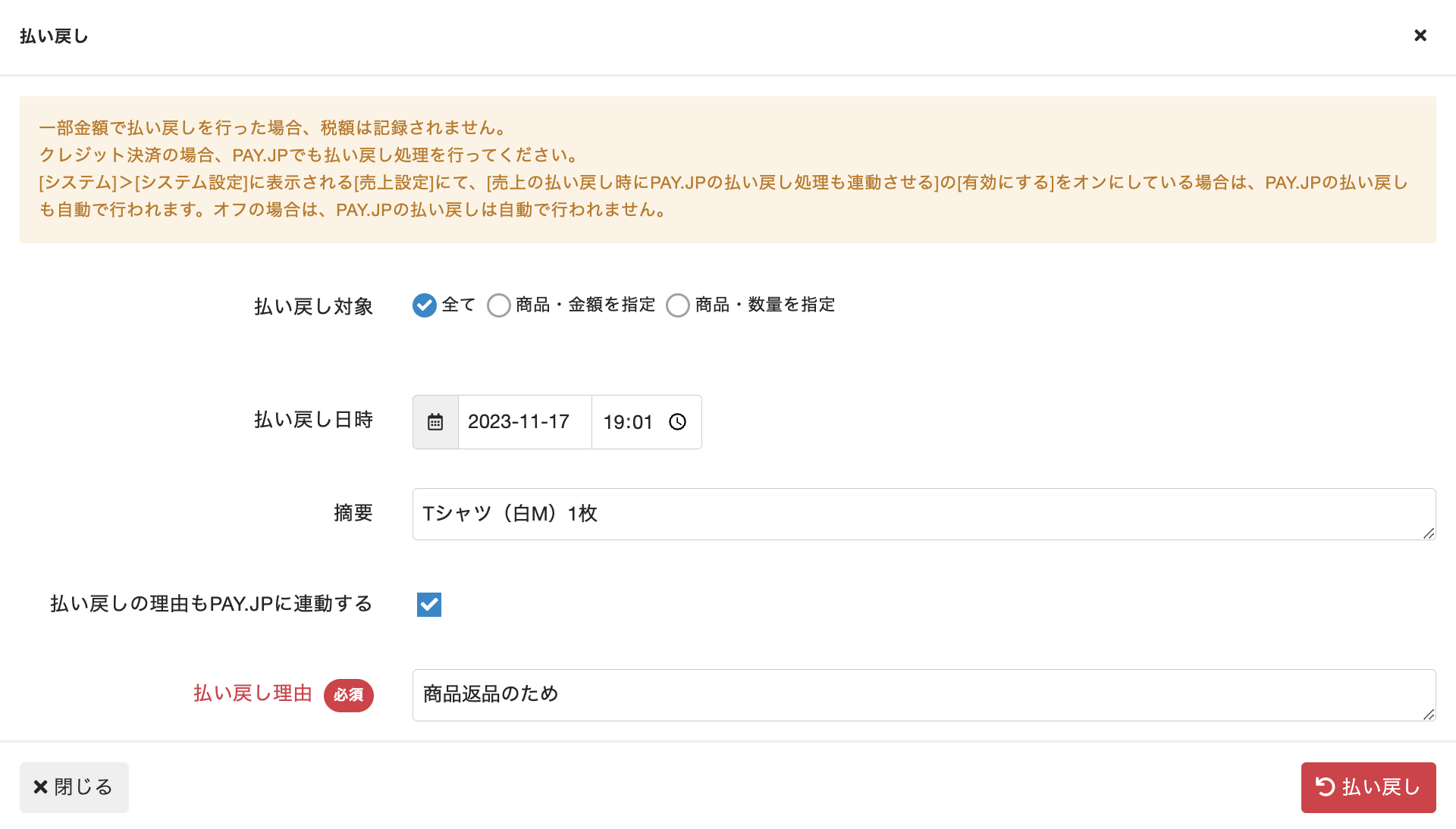 Note:hacomonoに登録されているクレジットカードで決済された売上で、決済代行サービスがPAY.JPの場合、hacomonoでの払い戻しがPAY.JPと連動しない設定のときは、PAY.JPで返金処理を行った日時を入力します。