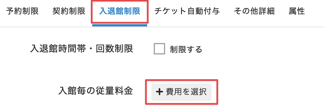 [入退館制限]タブの[入館毎の従量料金]で[費用を選択]をクリックします。