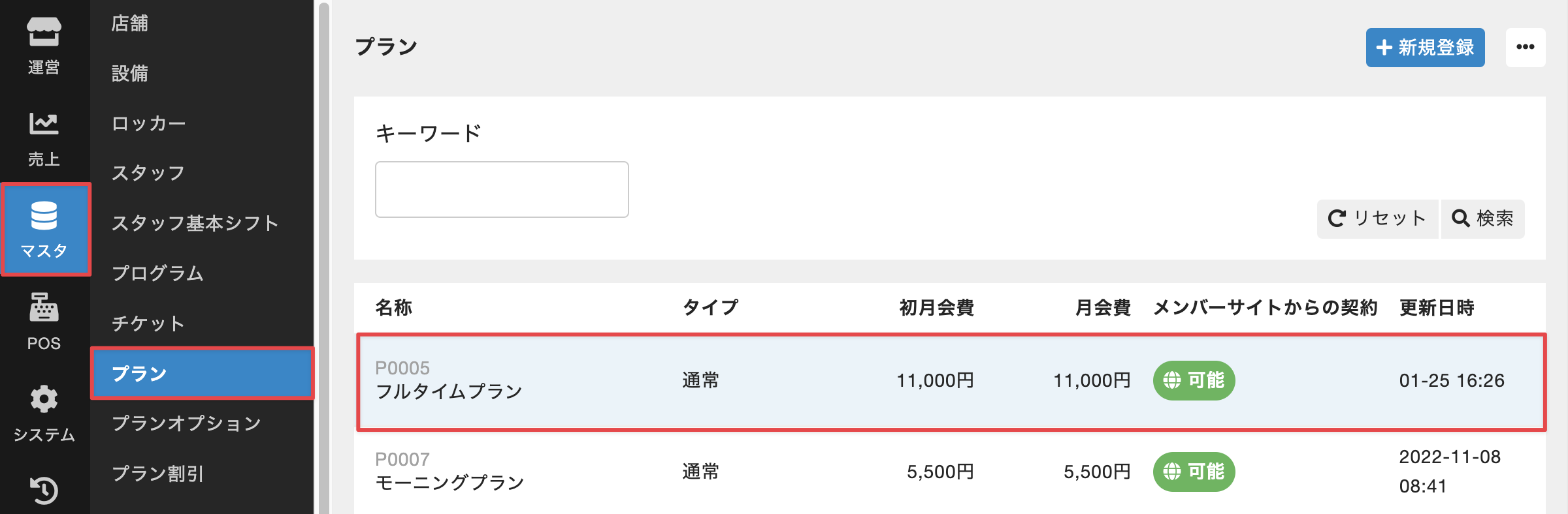 管理サイトのサイドバーから[マスタ]>[プラン]を選択し、プランの一覧画面でプランを選択します。