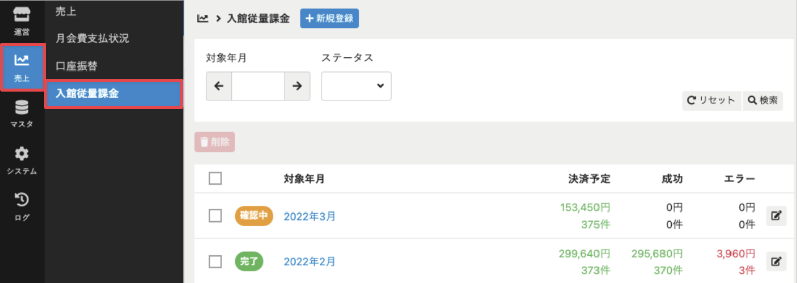 入館従量課金の決済の予定金額、決済処理の状況のデータは、当月分が翌月3日に自動生成され、管理サイトのサイドバーから[売上]>[入館従量課金]を選択すると表示される入館従量課金画面で確認することができます。