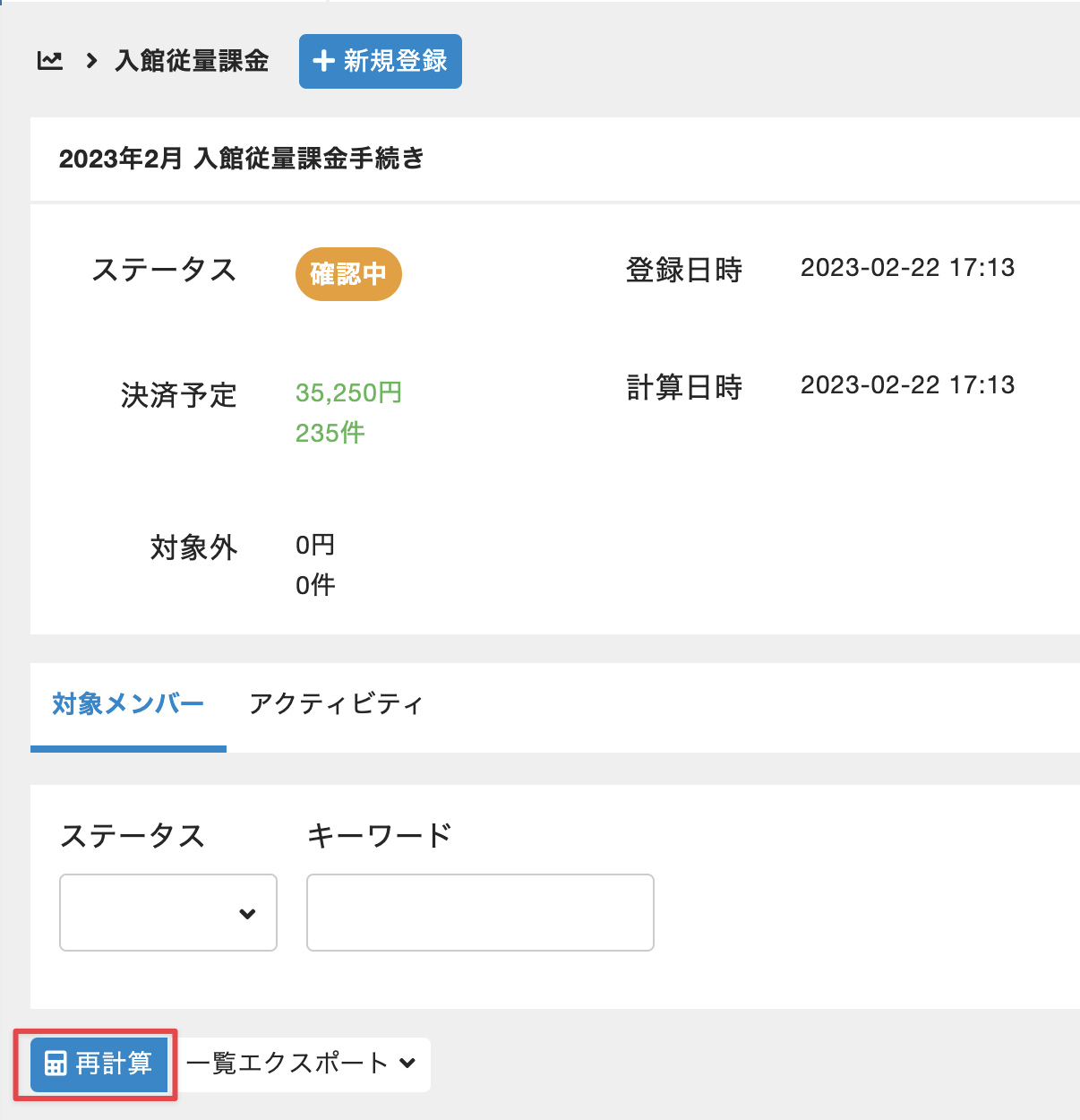 毎月3日の入館従量課金のデータ自動生成後も、10日の決済前日の9日まで1日1回自動で再計算されます。3日以降にデータ変更し即時反映したい場合やメンバーの契約プランを削除・編集した場合は、対象月の入館従量課金画面で手動で再計算してください。