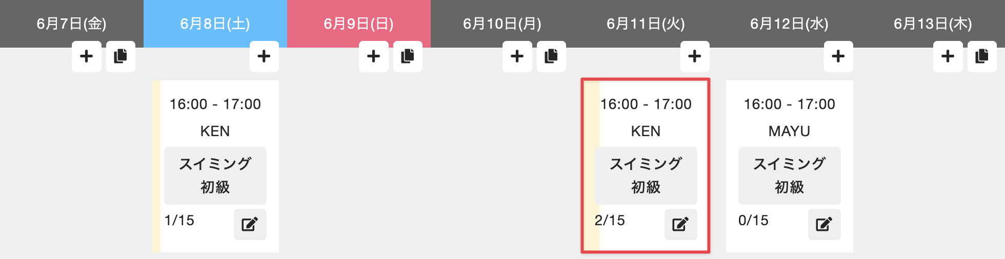 - 管理サイトのサイドバーから[運営]>[予約スケジュール]を選択し、店舗名、予約カテゴリ、レッスン日の週を選択します。