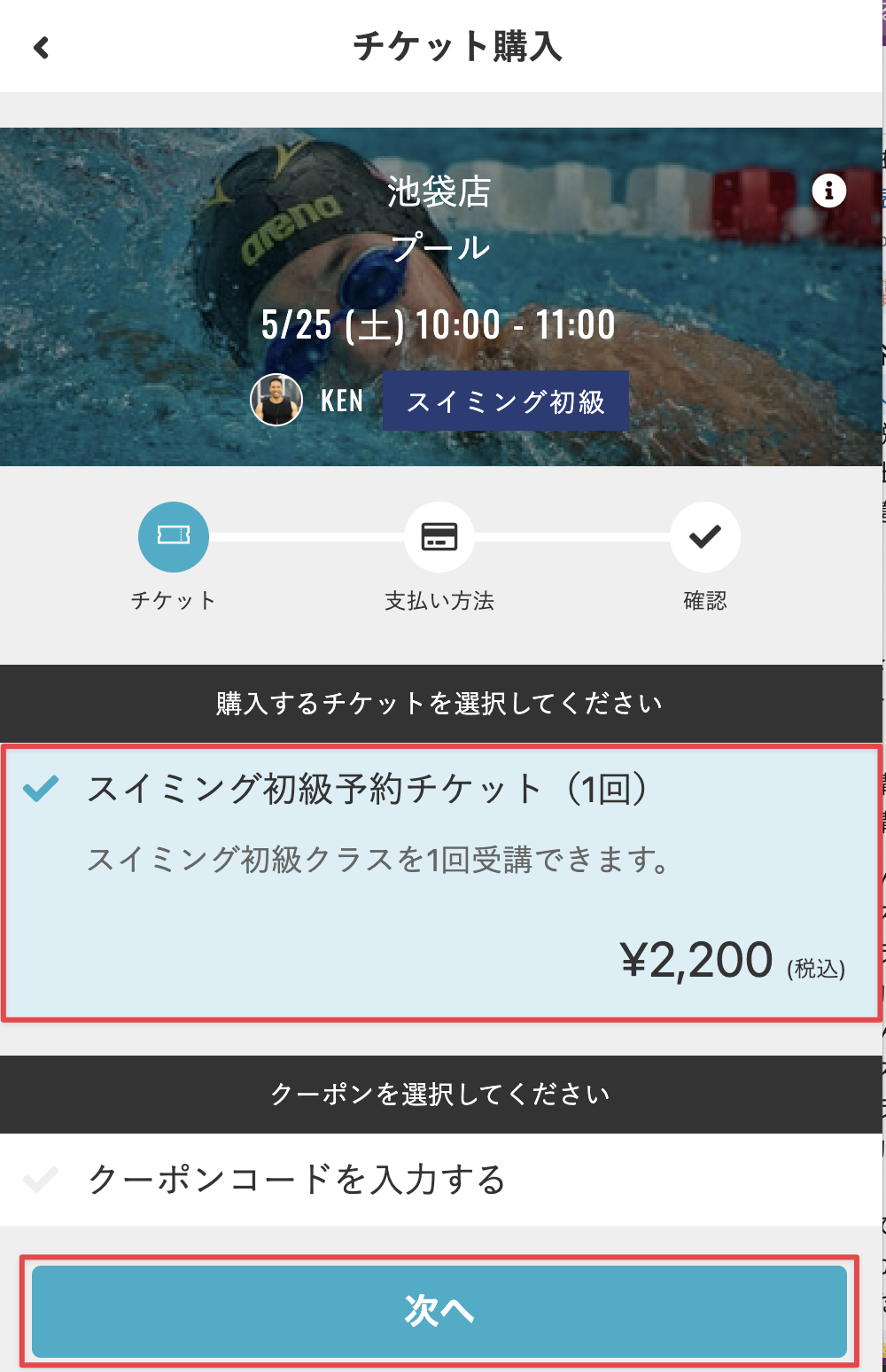 - 予約用のチケットを選択し、[次へ]をタップします。