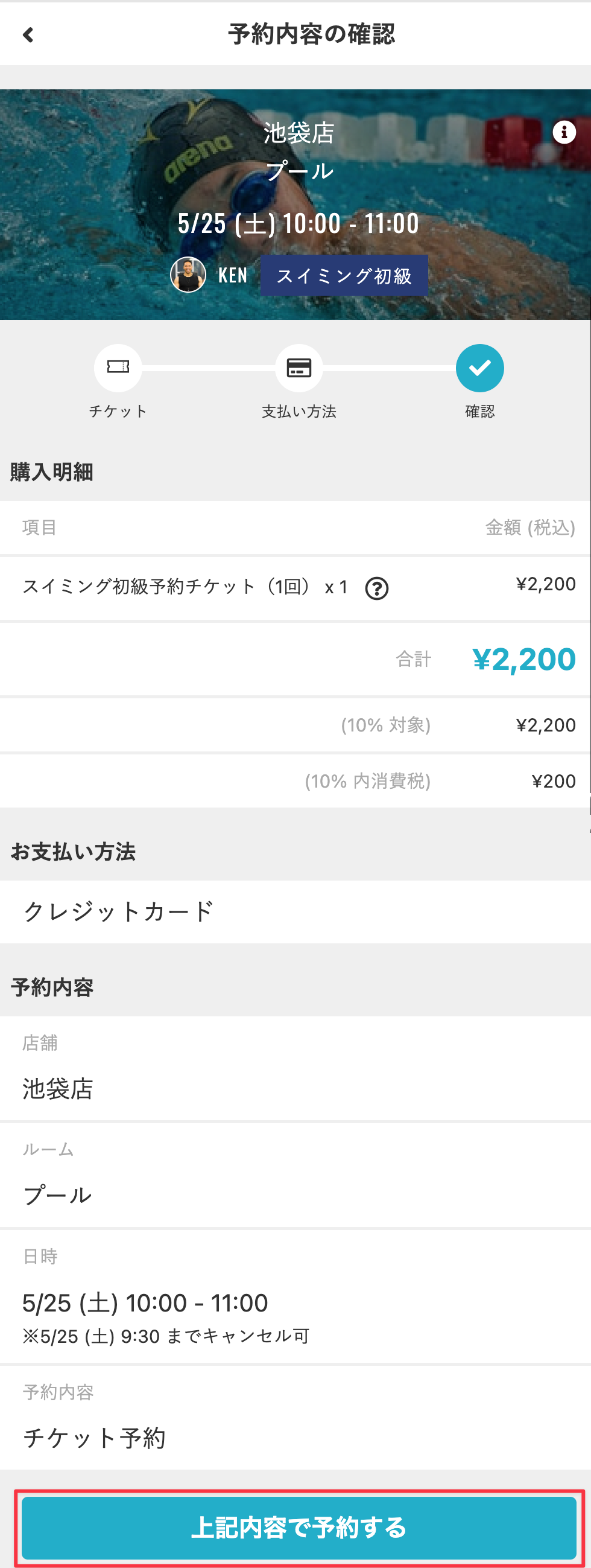 - 予約内容を確認し、[上記内容で予約する]をタップします。