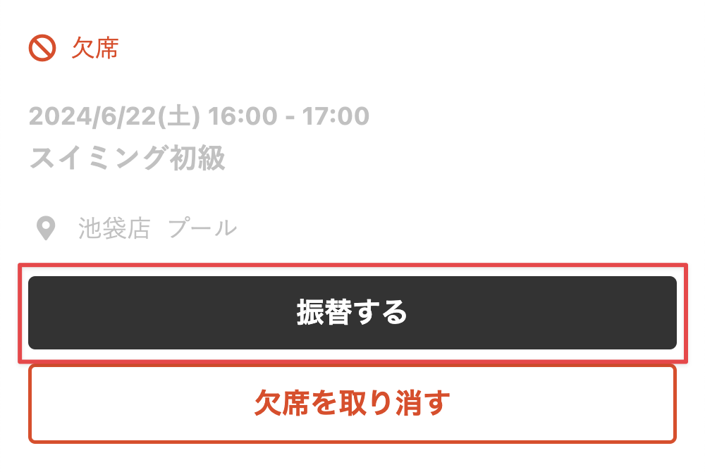 - 欠席手続きしているレッスンの[振替する]をタップします。