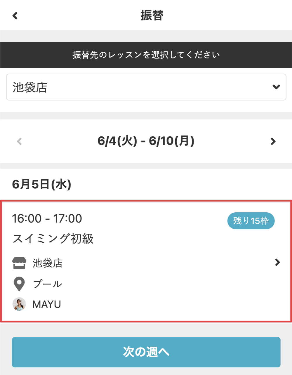 - [<]や[>]、[次の週へ]や[前の週へ]をタップして、振替先のレッスンの週に移動します。