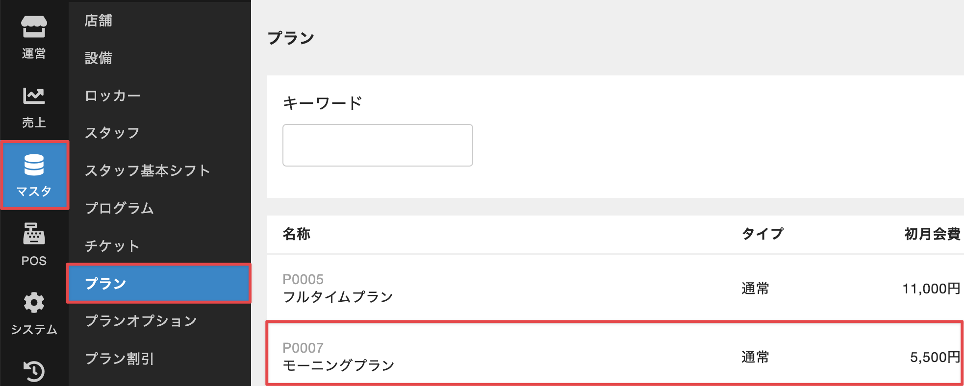 - 管理サイトのサイドバーから[マスタ]>[プラン]を選択し、プランの一覧画面でプランを選択します。