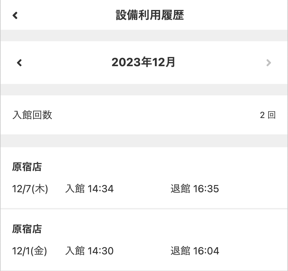 Note:同じ日の同じ時間帯に複数回入館された場合、入館回数は1回となります。複数の時間帯で入館できるプランの場合は、それぞれの時間帯で個別に入館回数をカウントします。複数の店舗で入館された場合は、すべての店舗での合計で入館回数をカウントします。