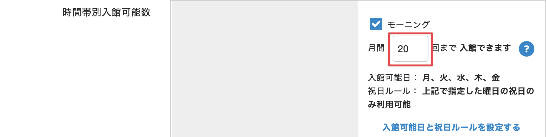 1ヶ月に入館できる回数を制限する場合、時間帯の入力欄に回数を入力します。未設定(空欄)の場合、入館できる回数は無制限になります。