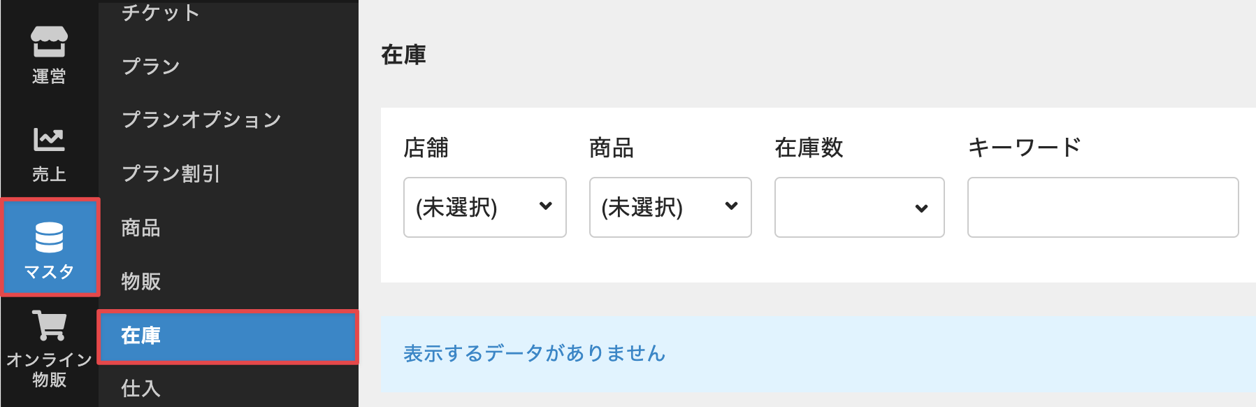 - 管理サイトのサイドバーから[マスタ]>[在庫]を選択し、在庫画面を表示します。