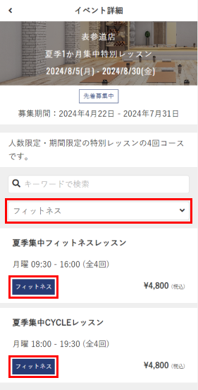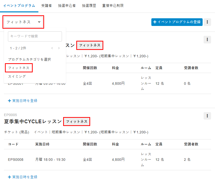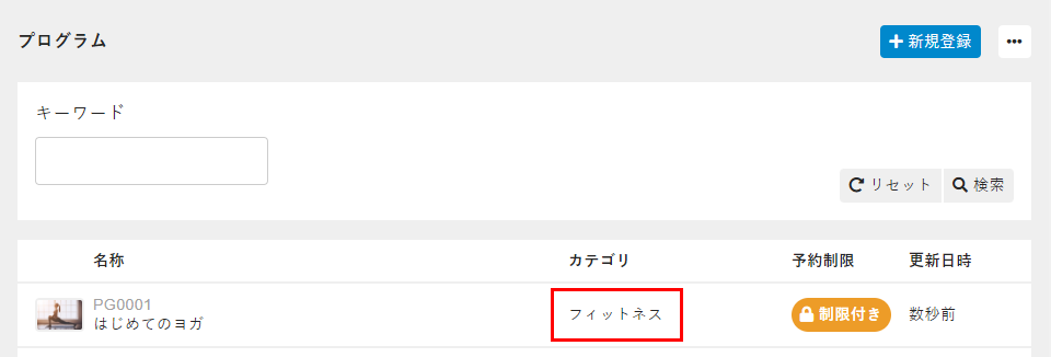 カテゴリを設定することで、カテゴリごとにトライアルレッスンの申し込み上限を設定したり、イベントプログラムの重複申し込みを制限(「重複の申し込み可否を設定する(イベント)」を参照)したりできます。