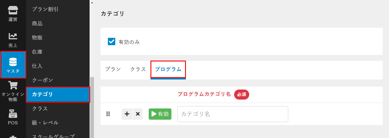 - 管理サイトのサイドバーから[マスタ]>[カテゴリ]を選択し、[プログラム]タブを選択します。