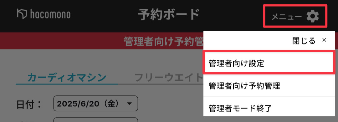 Note:ここでは予約ボードの管理者モードの画面で説明します。予約ボード管理サイトで設定する場合も同様の手順で行うことができます。