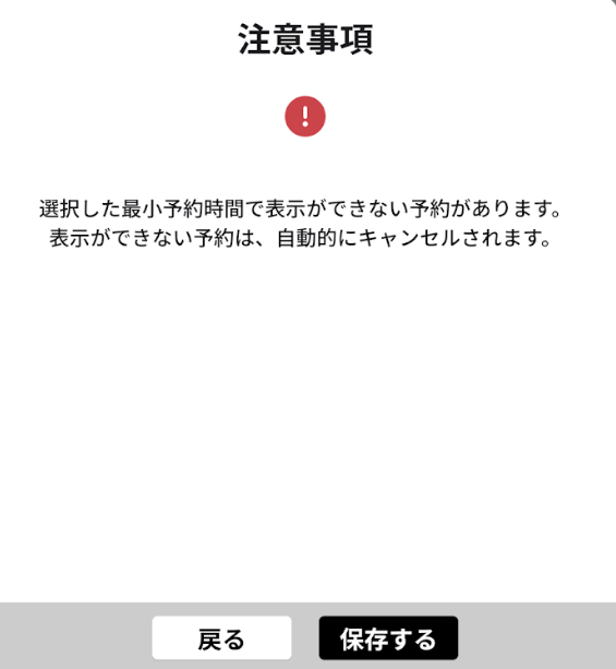 | 最小予約時間 | 予約時間の最小単位。 [最小予約時間]を変更すると、[カテゴリ1][カテゴリ2][カテゴリ3]の[最大予約時間]も自動的に変更されます(「予約対象を登録する(予約ボード)」を参照)。 予約が入っている状態で[最小予約時間]を変更する場合、変更後の最小予約時間を適用できない予約があると、[保存する]のタップ時に対象の予約が自動的にキャンセルされる旨のメッセージが表示されます。キャンセルされると問題がある場合は[戻る]をタップし、設定値や予約状況を確認してください。例えば、16:10?16:20の予約がある状態で [最小予約時間]を10分から15分に変更した場合、16時台の予約開始時刻は16:00?、16:15?、16:30?、16:45?となり、16:10開始を適用できないため、このメッセージが表示されます。 |