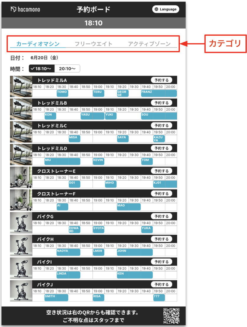 予約ボードで予約可能な対象は、最大3つのカテゴリに分けて予約ボードに表示できます。各カテゴリには最大10個まで予約対象を登録できます(「予約対象を登録する(予約ボード)」を参照)。
