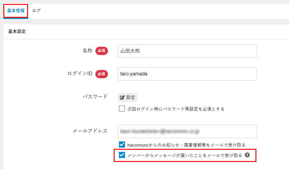 [基本情報]タブの[メンバーからメッセージが届いたことをメールで受け取る]にチェックを入れます。