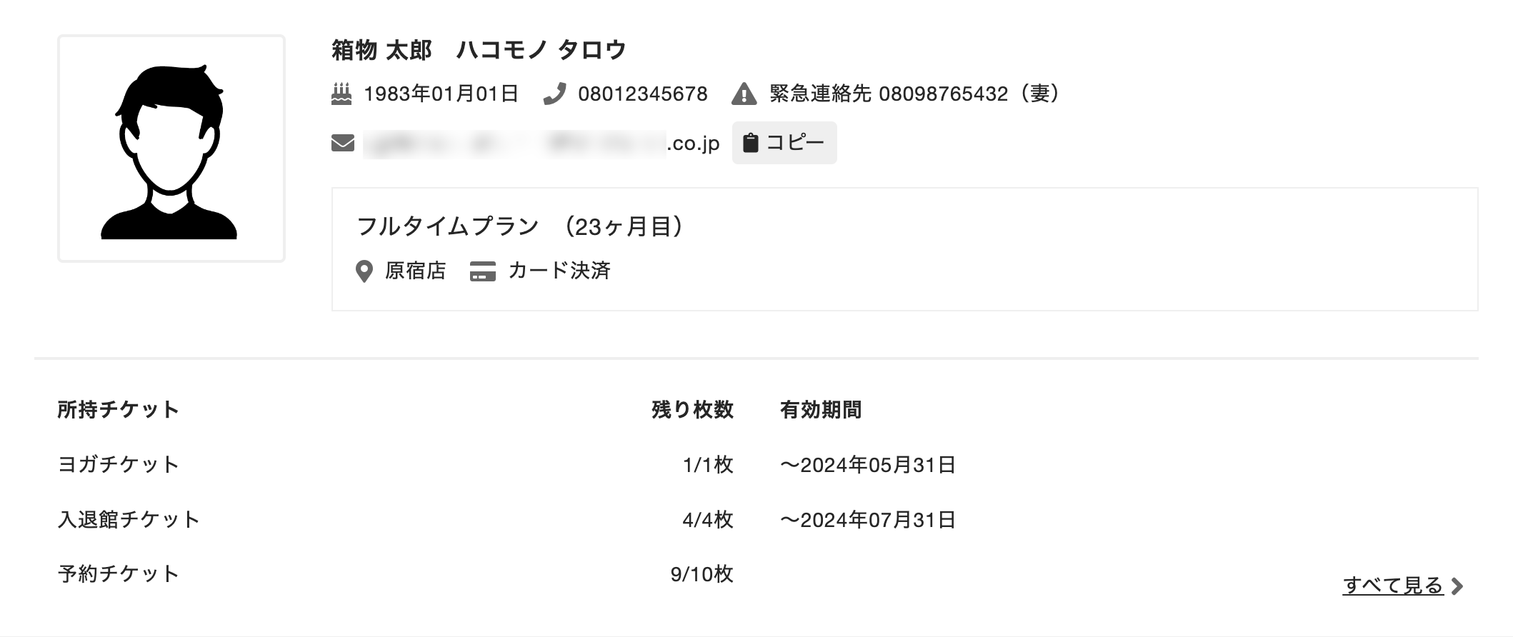 氏名や誕生日、電話番号などの基本情報のほか、契約プランや所属店舗、支払い方法などが表示されます。