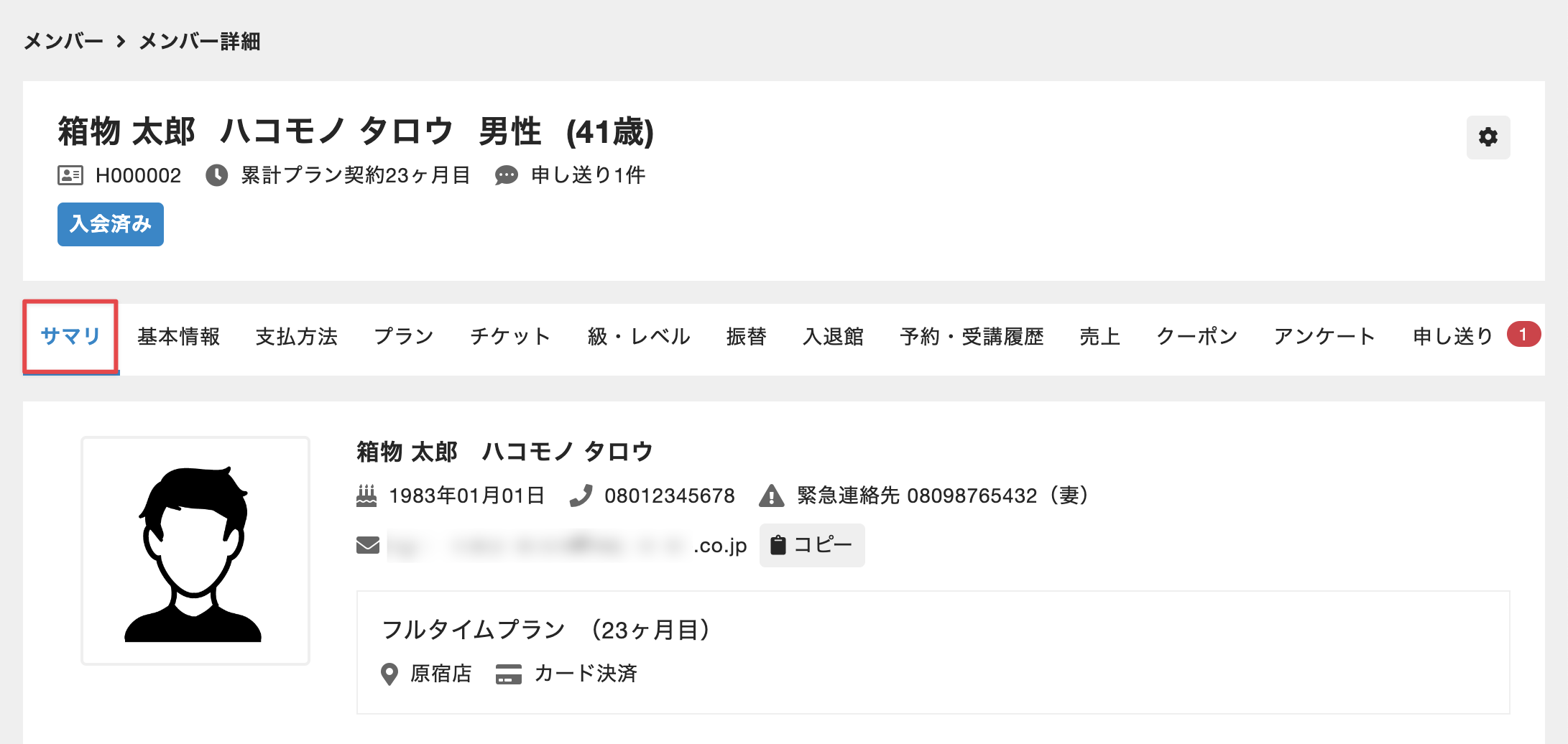 メンバー詳細画面の[サマリ]には、お客さま対応などのフロント業務で頻繁に確認する以下の情報が見やすくまとめられています。