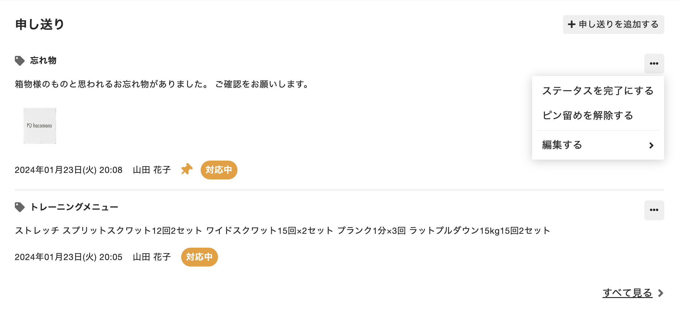 対応中やピン留めの申し送りが登録日の新しいものから3つまで表示されます。