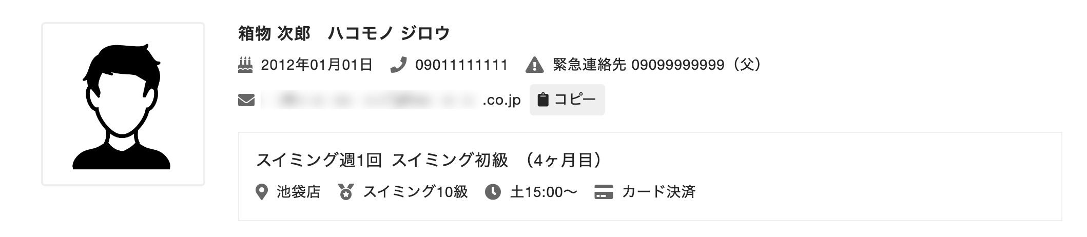 メンバーがスクールを契約している場合、現在の級・レベルや受講曜日・時間、所持している振替権利も表示されます。