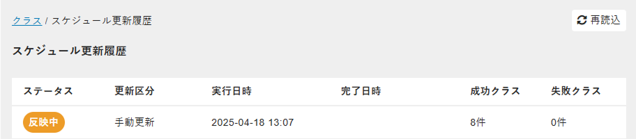 何らかの問題があった場合、「失敗クラス」にエラー件数が表示されます。詳細については、「スケジュールの更新で「失敗クラス」が表示された場合」を参照してください。 -