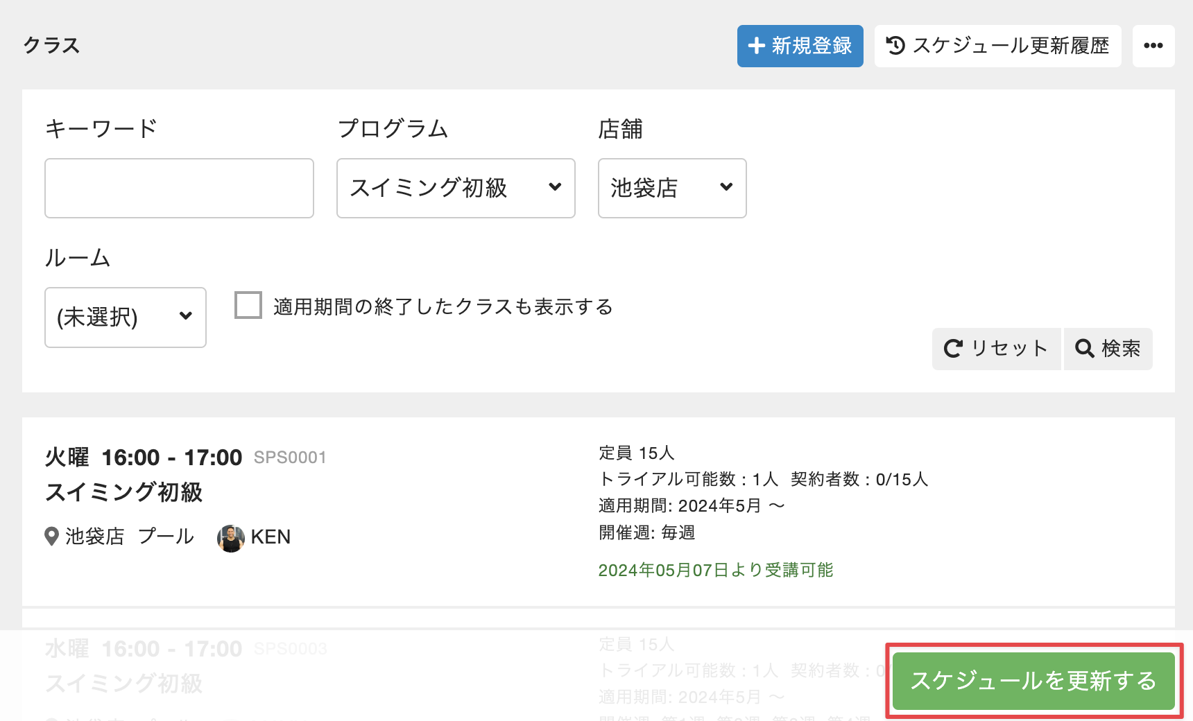- クラスの一覧画面で[スケジュールを更新する]をクリックします。