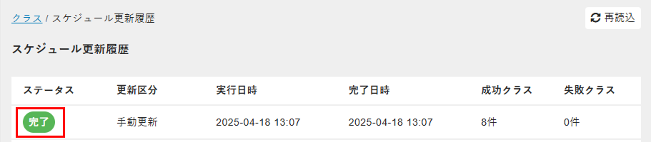 - スケジュールの更新が正常に完了すると、更新履歴の一覧の[ステータス]に[完了]が表示されます。