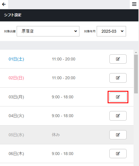 対象年月のシフトが一覧で表示されます。 - シフトを編集する日にちの編集アイコンをタップします。