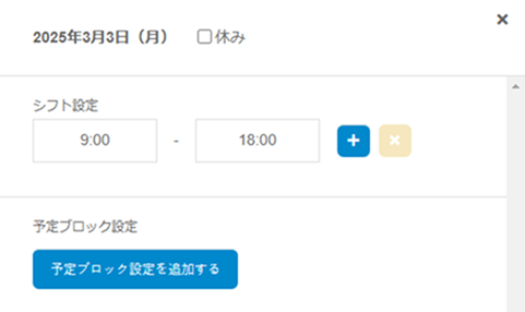 設定の前に:スタッフ管理サイトでシフトを設定するには、スタッフの基本シフトと店舗のシフトを事前に設定しておく必要があります(「スタッフの基本シフトと店舗のシフトを設定する(自由枠予約向け)」を参照)。