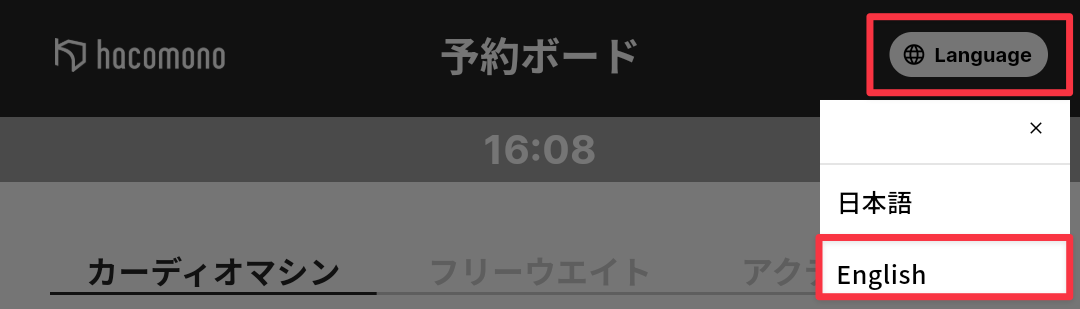 予約ボードの言語を日本語から英語に切り替えるには、以下の手順を行います。
