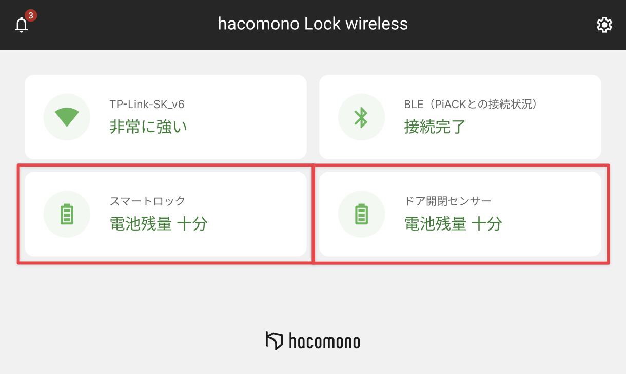 - ロックワイヤレス本体の電池残量は[スマートロック]を、ドア開閉センサーの電池残量は[ドア開閉センサー]を確認します。
