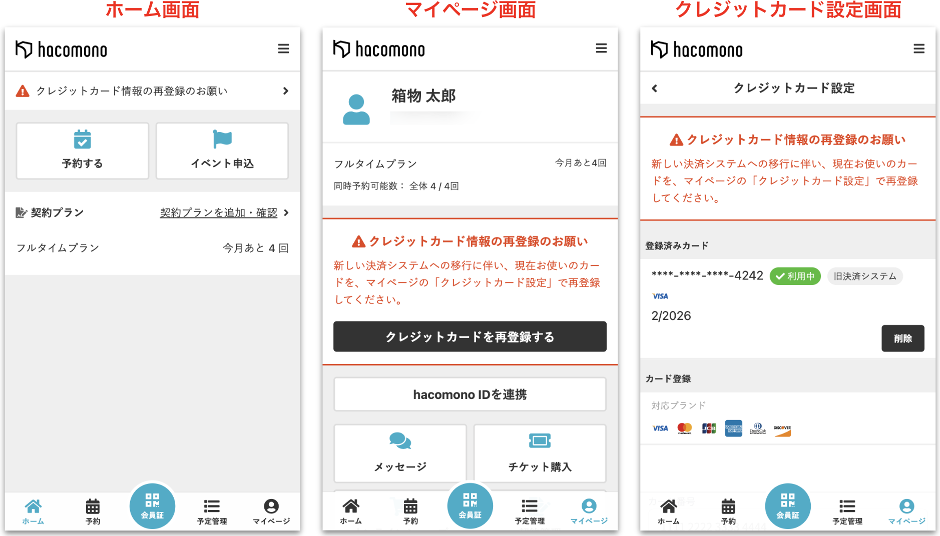 クレジットカード決済でhacomono決済とPAY.JPを併用している場合、PAY.JPのカードが利用中になっているメンバーに対し、クレジットカード情報の再登録を促すメッセージが表示されます。