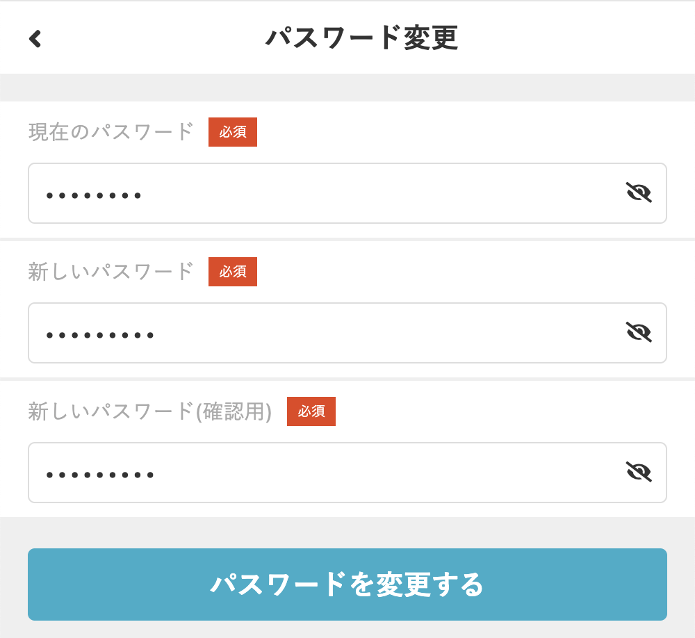 [パスワード]には店舗から案内されたパスワードを入力します。 - パスワード変更画面が表示されるので、店舗から案内されたパスワードを[現在のパスワード]に、新しいパスワードを[新しいパスワード][新しいパスワード(確認用)]に入力し、[パスワードを変更する]をタップします。