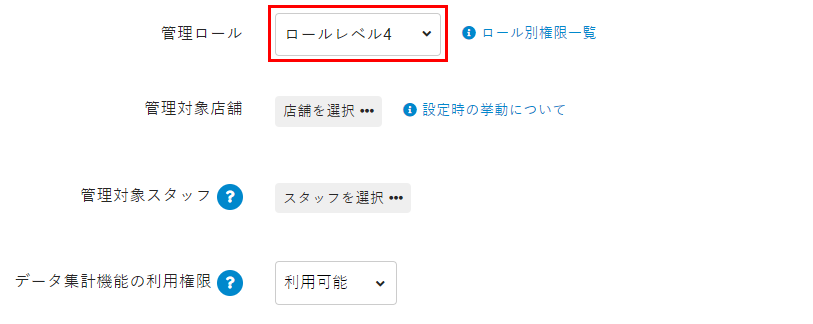 データ集計機能の利用にはロールレベル4以上の権限が必要です(ロールレベル設定が初期設定の場合)。データ集計機能の利用権限を他の管理ユーザーに付与するには、[管理ロール]が[ロールレベル5]または未選択で、[データ集計機能の利用権限]に[権限付与可能]が設定されている管理ユーザーでログインする必要があります。