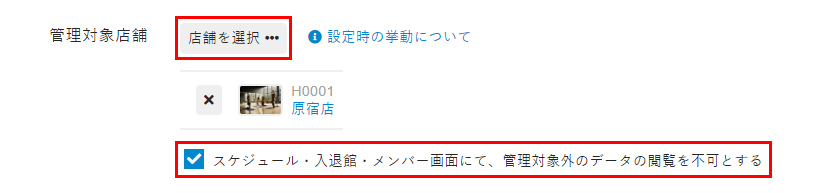 Note:特定の店舗のデータのみ閲覧できるように制限したい場合は、[管理対象店舗]を設定し、[スケジュール・入退館・メンバー画面にて、管理対象外のデータの閲覧を不可とする]にチェックを入れてください。